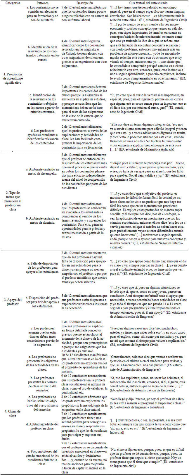 Finalmente, en la Tabla 5 se presentan los patrones que se identificaron respecto a los aspectos del ambiente de clase percibidos por los estudiantes en cada una de las categorías según las entrevistas semiestructuradas aplicadas a los 12 estudiantes seleccionados para tal fin, a saber: promoción de aprendizaje significativo, tipo de metas que promueve el profesor en clase, apoyo del profesor, y clima de clase.
