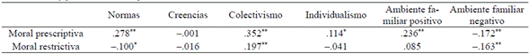 Una vez obtenidos los factores de segundo orden de las escalas, se procedió con las correlaciones y los análisis de regresión lineal múltiple. Como se muestra en la Tabla 1, se encontraron correlaciones estadísticamente significativas y positivas de la moral prescriptiva con las normas, el colectivismo, el individualismo y el ambiente familiar positivo, así como una correlación estadísticamente significativa y negativa con el ambiente familiar negativo; mientras que para la moral restrictiva se encontraron correlaciones estadísticamente significativas y negativas con las normas y el ambiente familiar negativo, así como una correlación estadísticamente significativa y positiva con el colectivismo.