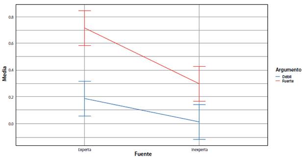 Y en tercer lugar, la experticia de la fuente pudo haber sesgado de manera positiva la producción de pensamientos sobre el mensaje persuasivo. Según esta interpretación, la fuente experta influyó en el procesamiento de los mensajes, lo cual ocasionó que se tuviera una consideración más favorable de ellos. De este modo, el argumento fuerte hizo que se potenciara aún más la producción de pensamientos favorables, y con ello generó más persuasión que cuando el argumento fue débil. Por otra parte, la fuente inexperta pudo no haber producido un sesgo -ni positivo ni negativo-, pues si bien la descripción de la fuente inexperta daba cuenta de un hombre que no tenía experiencia en el tema, y no se mencionaba ningún aspecto negativo que produjera un sesgo. Ello explicaría por qué el grupo "argumento fuerte/fuente inexperta" no tuvo el incremento que la fuente experta dio al argumento fuerte en el grupo "argumento fuerte/fuente experta" (véase Figura 1).
