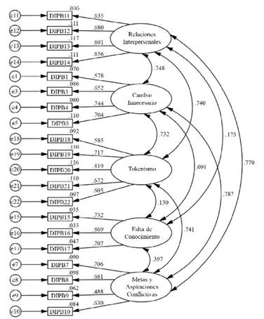 Finalmente, en la Figura 1 se presenta la estructura factorial mediante un path diagram con sus respectivas correlaciones y estimaciones de parámetros estandarizados. La escala aplicable se encuentra en el Apéndice A.