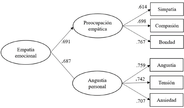 Acorde a la literatura, el presente estudio propone un modelo factorial de segundo orden para la empatía emocional situacional y sus componentes, la preocupación empática y angustia personal.