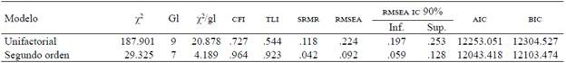En el modelo unifactorial ningún indicador fue adecuado, en el factorial de segundo orden lo fueron los índices CFI y SRMR, mientras que el resto (X 2/gl, ТЫ y RMSEA) estuvieron cerca del límite de aceptabilidad. Tal como fue hipotetizado, la estructura de segundo orden tuvo un mejor ajuste que la unifactorial (X 2 diferencia (2) = 158.576, p < .001, |ΔCFI| = .237, |ΔRMSEA| = .696, y |ΔSRMR| = .076, todos > .01, |ΔAIC| = 209.633 > 10 y |ΔBIC| = 201.053 > 10).