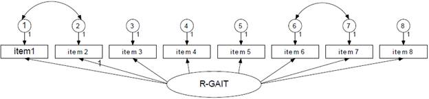 To further examine its factor structure, a CFA was conducted with the eight items of the R-GAIT to test the modelling that had emerged in EFA, such as presented in Figure 1. An inadequate modelling fit was found, as shown in Table 2 (Model 1). When looking at the under-specification indices, two covariances were found between the measurement errors of items 1 and 2, and 6 and 7, respectively. By specifying the covariance between the measurement error between items 1 and 2 and between items 6 and 7 (42.37 and 60.87, respectively), as shown in Figure 2, the model fit increased satisfactorily for all indicators, as presented in Table 2. This re-specification was carried out following Byrne (2010, 2012) who indicates that such covariances may be due to the fact that the items ask about similar topics or there is a bias in answering these questions. Although the x2 of the model was significant (p <.02), when divided by the degree of freedom, a value of 1.79 was found. The factor loading of each item was significant (p <.001) and ranged from .31 to .77. The mean variance extracted was 1.51.