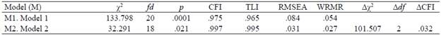 Note. fd = degrees of freedom. CFI = Comparative Fix Index. TLI = Tucker-Lewis Index. RMSEA = root mean square of residuals. WRMR = weight root mean square residual. ΔX2 = difference in X2 between models. Δdf = difference in degress of freedom between models. ΔCFI difference of CFI between.