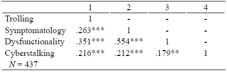 To explore the concurrent validity of the R-GAIT, Spearman correlations were computed between scores of R-GAIT and the dark triad of personality, on one hand, and scores of R-GAIT and addiction to the Internet and cyberstalking. As shown in Table 3, trolling scores correlated positively and significantly with Machiavellianism, narcissism, and psychopathy. Also, trolling scores correlated positively and significantly with dysfunctionality, symptomatology, and cyberstalking, as is shown in Table 4.