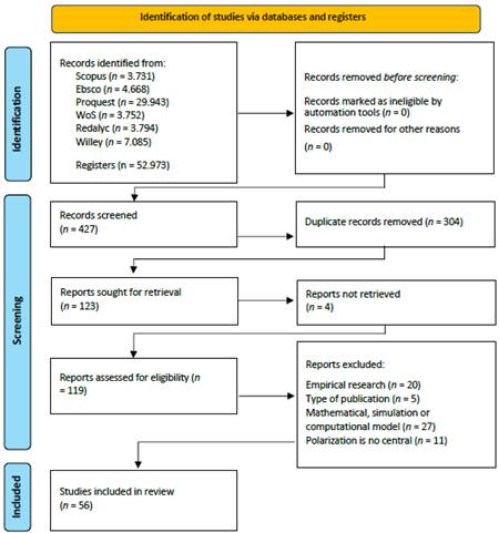 The Preferred Reporting Items for Systematic Reviews and Meta-Analyses - PRISMA (Page et al., 2021) protocol was used to conduct the review. The methodology is described using the three phases of the PRISMA flowchart: identification, screening, and inclusion (Figure 1). In the identification phase, six databases (Scopus, Wows, Proquest, Redalyc, EBSCO, and Willey) were consulted to identify systematic reviews, non-systematic reviews, grey literature, and theoretical chapters on polarization as a social phenomenon.