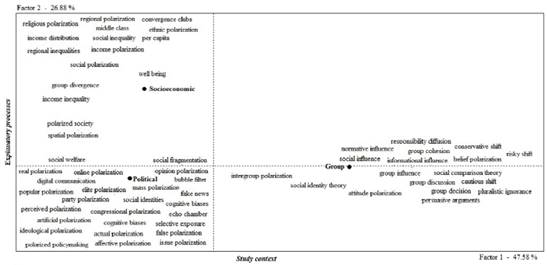 From the 56 publications, the Spad analysis provided a list of repeated segments, and those that mentioned polarization with a noun (e.g., affective polarization, religious polarization, attitude polarization) were selected, considering these as polarization subclasses. Then, a factorial analysis of correspondences between categorical variables (group, socioeconomic, and political) and the selected repeated segments was performed. The results are presented in a two-dimensional plane (figure 2). In this way, a statistical identification and classification of the subclasses of polarization mentioned in the publications was obtained.