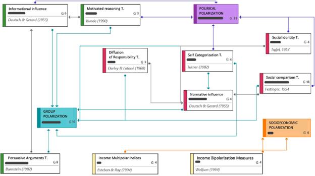 Note. The letter G stands for the grounded property of the categories. In the case of polarization classes (group, political and social), it refers to the number of articles that were classified in that class. In the case of theories, it represents the number of articles in which each theory was mentioned.