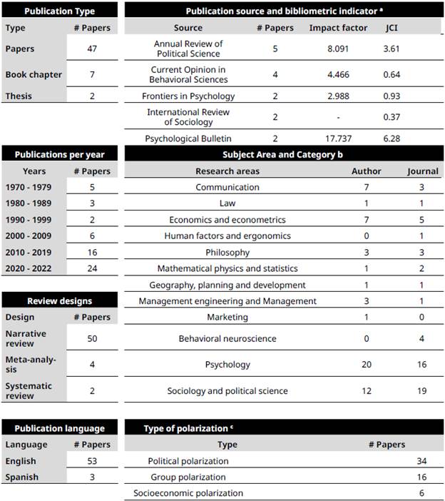 The results section is organized according to four research questions. The first section describes the bibliometric indicators of the 56 publications selected. Table 2 shows data such as year, type, most published sources, subject areas, designs, language of publication, and type of polarization.