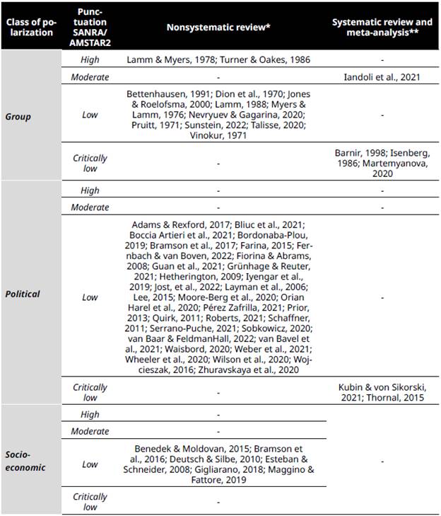Despite the relevance and considerable evidence on polarization, the lack of systematic reviews is the main limitation in its study consolidation. Although 56 reviews were selected, most were of the narrative type. According to the quality criteria of the SANRA instrument, most lacked the method, rigor, and systematicity to draw reliable conclusions. In turn, the selected systematic reviews did not meet the AMSTAR2 quality criteria. Thus, there is a need to develop systematic reviews or meta-analyses with the required methodological rigor. We suggest that, given that this concept is polysemic and consists of several classes and subclasses, the reviews to be carried out should focus on a specific class or a delimited polarization phenomenon.