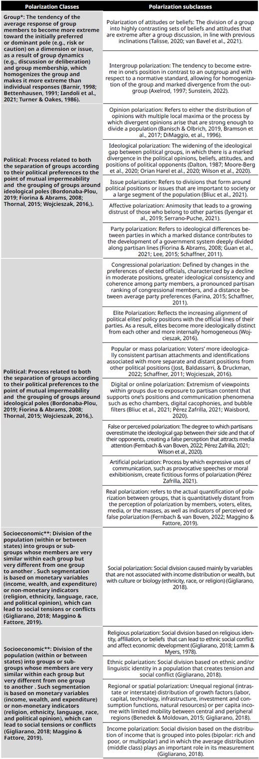 * It includes both intragroup and intergroup processes of polarization. ** Some publications refer to social polarization in an ambiguous way, indicating economic and non-economic aspects; therefore, this socio-economic class is referred to in order to establish the conceptual difference and to include the monetary aspects of polarization.