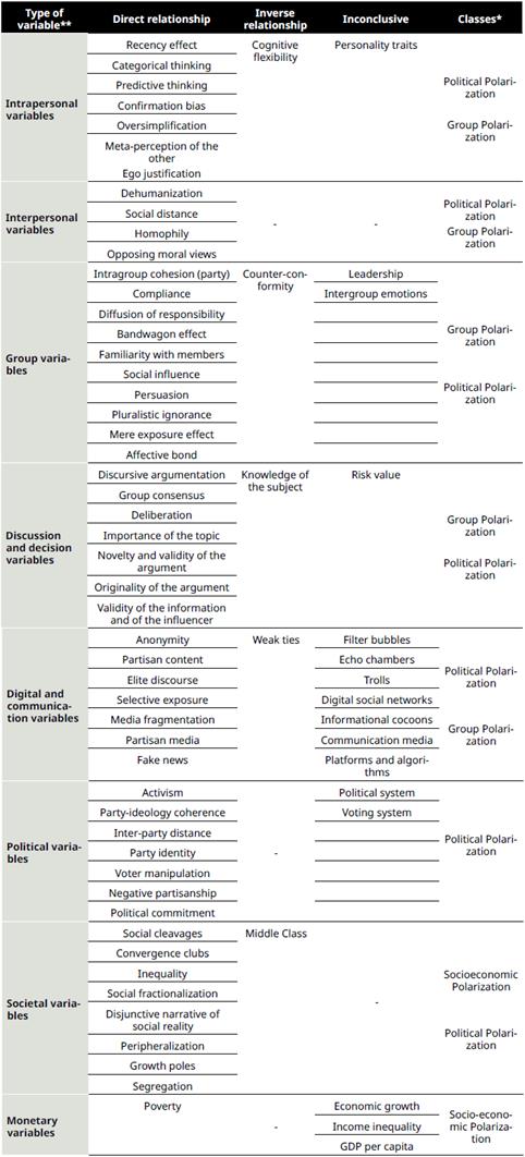 72 variables have been identified as related to polarization. Of these, 51 are variables that have a direct relationship with the phenomenon, that is, they increase polarization. Five variables have an inverse relationship with polarization and 16 are inconclusive. Table 5 shows the variables grouped into eight types, according to their nature. It also refers to the type of polarization with which they are associated.