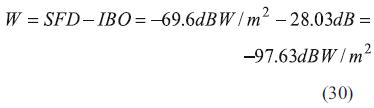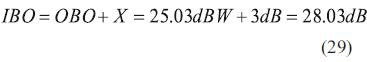 La reducción de la potencia de entrada (IBO) se defne como la relación entre la densidad del flujo de saturación y la densidad del flujo de operación de una portadora [37] y la reducción de la potencia de salida (OBO) se define como: