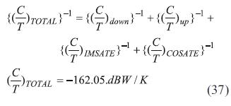 Lo son las pérdidas por espacio libre, Lu son las pérdidas atmosféricas de subida adicionales. Las señales de subida y de bajada deben pasar por la atmósfera de la tierra, donde son absorbidas parcialmente por la humedad, oxígeno y partículas en el aire [13], [20] y [29-30]. Dependiendo del ángulo de elevación, la distancia de viaje de la señal RF por la atmósfera varía de una estación terrena a otra, debido a que Lp y Lu representan pérdidas, son valores decimales menores a 1. G/Te es la ganancia de la antena receptora del transponder mas la ganancia del LNA dividida por la temperatura de ruido equivalente de entrada [53], [54].