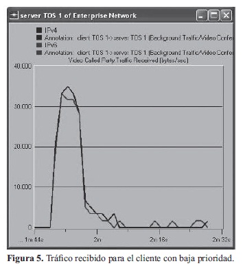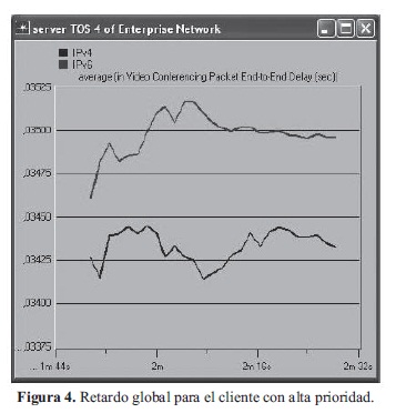 En las Figuras 3 y 4 se observa el retardo extremo a extremo para los clientes con menor y mayor prioridad; el cliente con mayor prioridad tiene un retardo menor.