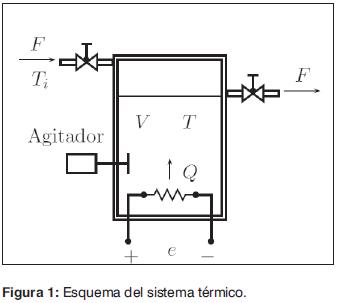 El sistema consiste en un control de temperatura para una bañera, este es un problema que se ha trabajado en [11]. Las especificaciones del sistema son: capacidad del tanque 15L (0,015m3), temperatura ambiente del agua 25oC, potencia de calefacción 2.500W, flujo del agua 1L/min (1,6x10-5 m3/s). La Fig. 1 muestra el esquema del sistema térmico considerado.