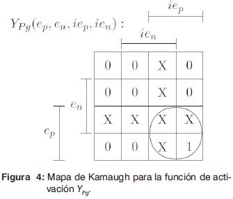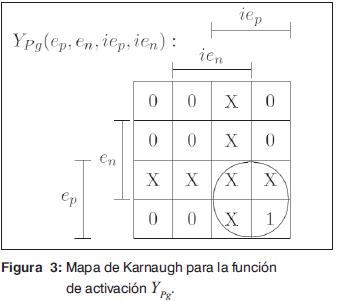 Para lograr los diferentes niveles de energía en la salida, se emplean las funciones de activación Booleanas Ypg y Ypp, de tal forma que la salida s puede calcular como: