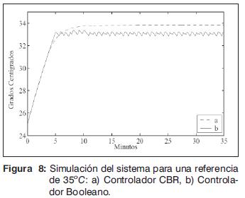 Para obtener la lrespuesta dinámica del sistema se implementó el controlador Booleano y CBR, tomando una referencia de 35°C. La Fig. 7 muestra la respuesta del sistema para el controlador Booleano y CBR. En esta figura se observa que el controlador CBR presenta un mejor comportamiento que el controlador Booleano.