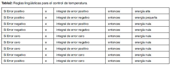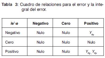 La tabla de reglas lingüísticas (Tabla 2), también se puede observar como un cuadro de relaciones para las regiones del universo de discurso del error y la integral del error, Tabla 3. En el cuadro de relaciones se observa que no existe acción de control negativa para el sistema, por lo cual esta acción queda sujeta a la inercia propia del sistema. Otro aspecto de importancia consiste en la falta de una acción en la zona de cero, siendo esto relevante al momento de plantear los conjuntos difusos.
