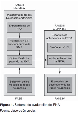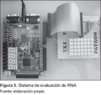 La evaluación de RNA se realizó en dos etapas: lo primero, es efectuar la verificación del funcionamiento de los modelos de redes implementadas en la FPGA para, posteriormente, evaluar el desempeño de las redes implementadas con respeto a la aplicación de reconocimiento de patrones.