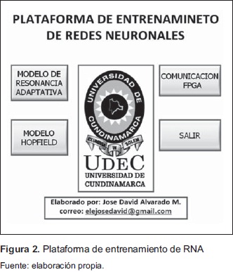 La plataforma de entrenamiento cuenta con un módulo que permite realizar el entrenamiento y la verificación del funcionamiento del modelo de resonancia adaptativa, de igual manera, cuenta con un módulo para el modelo Hopfield que cumple la misma función, el módulo de comunicación con la FPGA permite presentar los patrones para ser transmitidos del PC a la FPGA y, por último, la opción de salir para terminar la ejecución de la aplicación.