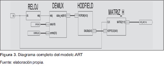 El diseño del modelo de ART (ver Figura 3) utilizando VHDL, se realizó incorporando el algoritmo de funcionamiento de modelo, en donde es necesario adicionar algunos componentes para el diseño del modelo como: reloj del sistema, demultiplexor y el sistema para la visualización.