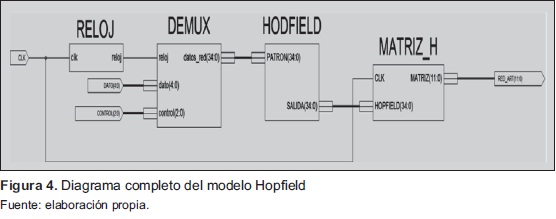 Para realizar la implementación del modelo Hopfield (ver Figura 4) se desarrolla el algoritmo de funcionamiento en VHDL, donde los bloques que hacen referencia al reloj del sistema y el de multiplexor se utilizan con los descritos anteriormente en el modelo ART (ver Figura 3).