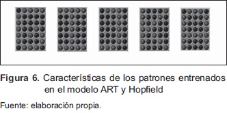El modelo ART es entrenado para clasificar diez patrones diferentes, compuestos por pixeles que representan los primeros caracteres del alfabeto, obteniendo una arquitectura del modelo red neuronal de 35 neuronas en la capa de entrada y de 10 neuronas en la capa de salida alcanzando 350 conexiones e igual número de pesos entre las neuronas Figura 6.