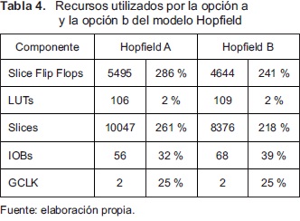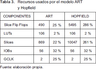 Los recursos utilizados por el modelo ART y el modelo Hopfield se muestran en la Tabla 3, en donde se encuentran los recursos usados y el porcentaje de utilización.