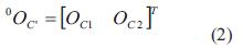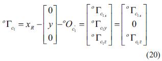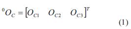 Con referencia al lente de la cámara se tiene el marco de referencia ΣC= {C1, C2, C3}. El origen del marco de referencia de la cámara está sobre el eje óptico y en el centro de la lente. Los planos (C1,C2) y (x, y) definen un plano perpendicular para el eje óptico. Por tanto, el eje C3 se alinea con el eje óptico. Un punto x con respecto al marco de referencia de la cámara se denota por xC =[xC1 xC2 xC3 ]T . Con referencia a la ubicación relativa entre los marcos de referencia Σ0 y ΣC se asume que los ejes C3 y z son paralelos; además, los planos C1 -C2 y x -y son también paralelos. El origen del marco de referencia de la cámara ΣC con respecto al marco de referencia cartesiano Σ0 se denota por 0OC y está dado por la ecuación (1).
