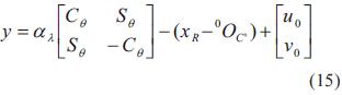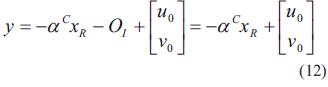 El vector [u0 v0 ]T es el corrimiento en la imagen del centro óptico de la cámara. Entonces la posición del efector final en el marco de referencia de imagen Σy (coordenadas de imagen) está dado en la ecuación (12):
