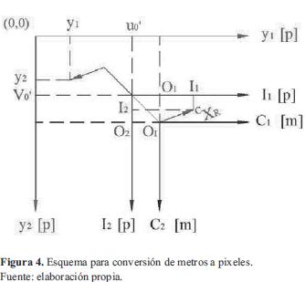 La figura 4, ayuda a visualizar cómo se realiza la conversión de metros a pixeles, para lo cual se requiere obtener el factor de escalamiento α, calculado a partir del tamaño de la superficie del arreglo CCD.