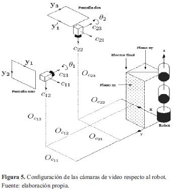 De esta manera, con la cámara 1 se obtienen las coordenadas (y1, y2 ) correspondientes al plano x, mientras que con la cámara 2, la coordenada y3 que es paralela al eje y. Nótese que la información de y1' no es relevante. Es decir, basta con despreciar y1' para aplicar el control de posición en 3D mediante las coordenadas ( y1, y2, y3). El objetivo de modelar las cámaras de video es conocer la expresión matemática que asigna las coordenadas de pantalla ( y1, y2 ) a un punto tridimensional con coordenadas (x, y, z) expresadas respecto a un sistema de referencia. Aunque en la realidad las coordenadas de pantalla se obtienen mediante el empleo de técnicas para el procesamiento de imágenes y herramientas computacionales, el modelo es necesario para realizar el diseño y el análisis del sistema de control, así como la simulación por computadora.