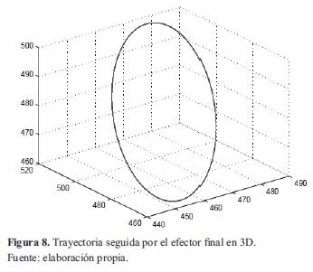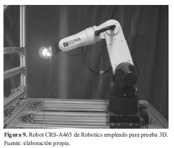 La ley de control implementada para validar el modelo en 3D está basada en la estructura básica del sistema Mamdani. Se establecieron como entradas los errores en la trayectoria en cada una de las coordenadas de imagen y las salidas son los valores de voltaje que se deben aplicar en cada una de las articulaciones del robot. En la figura 8 se muestra la forma de onda obtenida con el robot CRS-A465 de Robotics ubicado en la Universidad Nacional Autónoma de México (figura 9).
