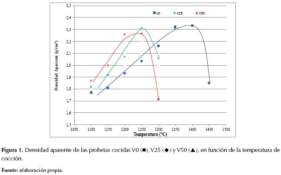 Se preparó 1 kg de cada muestra por molienda en seco mediante el uso de un molino de bolas, utilizando como medio de molienda cuerpos moledores de alúmina con geometría cilíndrica, durante un tiempo de 30 minutos. 25 g de cada mezcla semiseca (6% agua) se prensaron uniaxialmente en un molde de acero a 50 MPa en especímenes prismáticos de 117,0 mm de largo x 27,0 mm de ancho y 4 mm de espesor. Los especímenes se secaron en un horno mufla a 110 °C y posteriormente fueron cocidos en un horno eléctrico de laboratorio (Carbolite RHF 1600) a una rampa de calentamiento de 20 °C/min entre 25 °C y 600 °C y un tiempo de sostenimiento de 6 minutos; y 20 °C/min desde 600 °C a la temperatura máxima de cocción y un tiempo de sostenimiento de 6 minutos. El enfriamiento de los especímenes cocidos se realizó dentro del horno, con el fin de evitar tensiones residuales macroscópicas (De Noni Jr., Hotza, Cantavella, & Sánchez, 2010). Las temperaturas máximas de cocción se encontraron en el rango de 1100 °C–1450 °C (dependiendo de la composición), a intervalos de 50 °C. La temperatura de máxima densificación fue determinada, para cada mezcla, a partir del gráfico construido densidad aparente en cocido en función de la temperatura máxima de sinterización (ver la figura 1), haciendo uso de las condiciones experimentales descritas previamente.