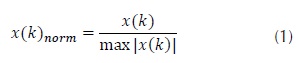 La base de datos es descrita por (Cabal-Yepez, 2009), pertenece a la Universidad de Guanajuato (México) y con ella se hicieron las pruebas en este trabajo usando las señales de vibración correspondientes a las direcciones x y y. En la etapa de preprocesamiento se remuestreó la señal a 150 Hz con un filtrado antialiasing y una normalización en la escala [-1, 1] usando la ecuación (1).