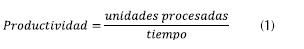 Se define la productividad en un puesto de trabajo como la relación existente entre un conjunto de unidades procesadas por unidad de tiempo (Sempere, 2008), obteniendo la siguiente ecuación: