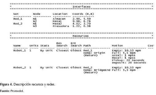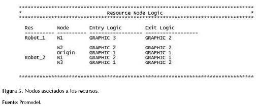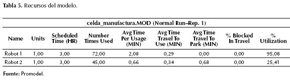 El número de veces que se utiliza cada uno de los robots en cada una de las secciones es 72 y 45 para el robot 1 y robot 2, respectivamente. El tiempo promedio de cada robot en cada una de las secciones fue 2,08 y 0,66 minutos. El recurso más utilizado es el robot 1. Lo anterior se puede observar en la figura 9, donde se detalla los resultados de la operación de los recursos en el modelo.
