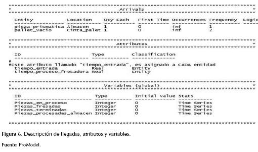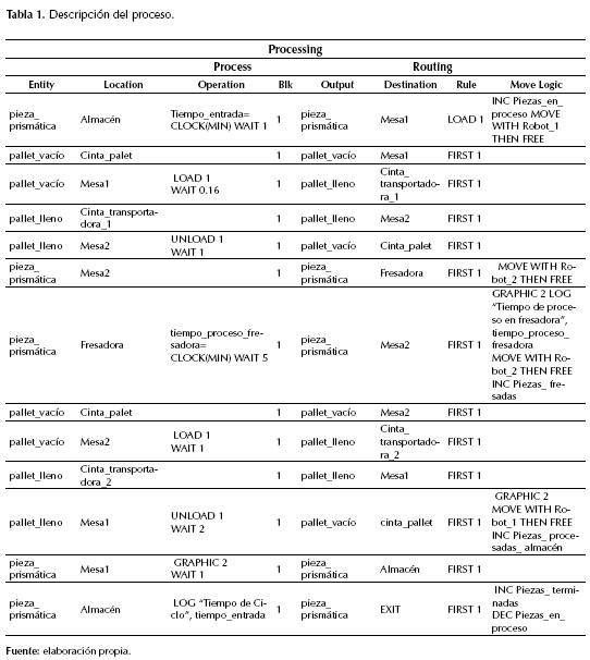 La simulación de estaciones de trabajo de una celda de manufactura flexible comienza por el reconocimiento del sistema e identificar la interacción existente que se requiere para hacer un modelo proactivo. Dicho modelo se desarrolla en “ProModel, el cual está diseñado para modelamiento de sistemas de fabricación que van desde pequeños talleres de trabajo y las células de mecanizado a gran escala de producción y los sistemas de fabricación flexibles" (Harrell, 2013). Los elementos básicos de modelado en ProModel son: locaciones, entidades, llegadas y procesos (Harrell, 2004). Las locaciones representan lugares fijos en el sistema; cualquier cosa que un modelo puede procesar se llama una entidad. En la figura 3 se encuentra la descripción de las locaciones y de las entidades. Algunos ejemplos son partes de una fábrica, los pacientes de un hospital, los clientes de un banco y los viajeros que llaman para hacer reservaciones aéreas. El mecanismo para definir cómo las entidades entran en el sistema se llama llegadas, las cuales se encuentran detalladas en la figura 6. Las entidades pueden llegar individualmente o en lotes. El tiempo entre las llegadas de entidades sucesivas se llama tiempo entre llegadas. El procesamiento describe las operaciones que tienen lugar en una locación, como la cantidad de tiempo que una entidad pasa allí, los recursos que necesita para completar el proceso, y cualquier cosa que sucede en el lugar, ProModel también incluye otros elementos, como la red de caminos descrita en la figura 4, atributos, recursos descritos en la figura 4, variables detalladas en la figura 6, los nodos asociados a los recursos referidos en la figura 5, etc. ProModel se centra en la utilización de recursos, la producción, la capacidad, la productividad, los niveles de inventario, cuellos de botella, tiempos de producción y otras medidas de rendimiento. ProModel es capaz de modelar los más complejos sistemas (Yu, 2006). La descripción del proceso se encuentra en la tabla 1.