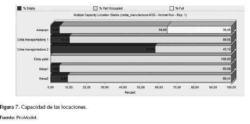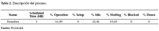 Para analizar el comportamiento de los procesos con el fin de mejorar la productividad de la simulación de la celda de manufactura flexible se tuvo en cuenta los resultados obtenidos, los cuales se muestran en la figura 7 y tabla 2.
