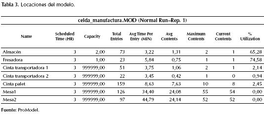 Se simula el modelo durante 3 horas del proceso de la celda de manufactura flexible y se obtiene un inventario final de 73 unidades que llegaron al almacén. Hay que tener en cuenta que en estas 73 piezas hay piezas sin fresar y piezas fresadas, que son los productos terminados. Lo anterior porque el almacén recibe la materia prima y el producto final; para lograr un mejor análisis se debe recurrir al resultado de las variables. La locación que tiene mayor porcentaje de utilización es la fresadora, ese alto porcentaje podría estar relacionado con el tiempo de proceso de la locación. A continuación, en la tabla 4, podemos observar el resultado de las variables.
