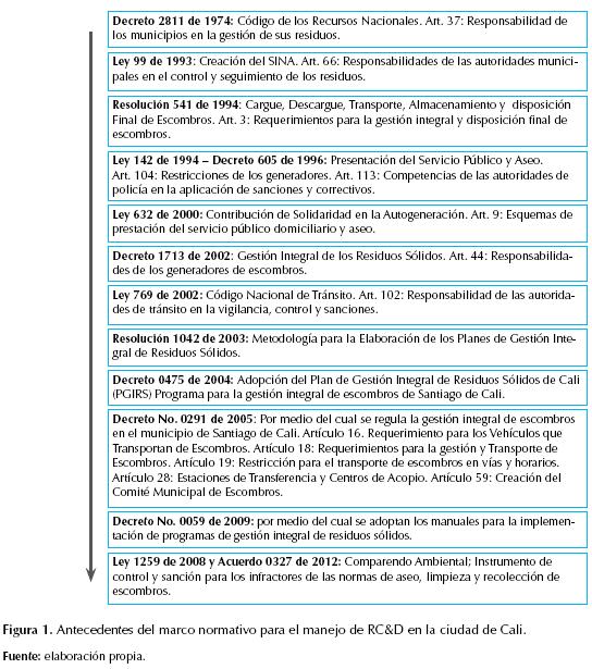 Por otro lado, en el caso de estudio el Decreto Municipal No. 0291 de 2005 regula la gestión integral de los RC&D y contiene las herramientas necesarias para que la Municipalidad adelante un buen manejo y regulación de estos residuos, incluyendo su generación, recolección, transporte, transferencia, aprovechamiento y disposición final. Así mismo establece, según el Artículo 59 del mencionado decreto, la creación del Comité Municipal de Escombros, como un espacio interinstitucional e intersectorial articulador de las acciones que desarrollen en el Municipio en esta temática (Alcaldía de Santiago de Cali, 2005) (DAGMA, 2012). En la figura 1 se presentan los antecedentes del marco jurídico del manejo de los RC&D en la ciudad de Cali; se puede observar que la mayoría de disposiciones tienen como finalidad la regulación del manejo de los RC&D desde su generación hasta su disposición final (Congreso de Colombia, 2000) (Alcaldía Mayor de Bogotá, 2002) (Congreso de Colombia, 2002) (Alcaldía de Santiago de Cali, 2004) (Alcaldía de Santiago de Cali, 2009).