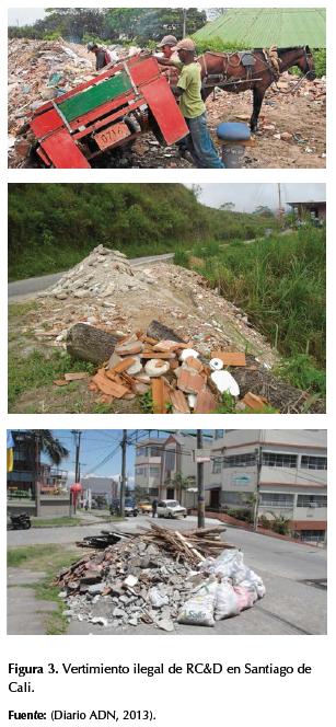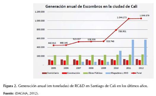 Actualmente en la ciudad de Santiago de Cali se producen cerca de 2480 metros cúbicos de estos residuos por día, cifra que en un año logra alcanzar un millón de metros cúbicos; esto de acuerdo con el número de habitantes llega a ser 0,5 metros cúbicos de RC&D por persona, índice que resulta alarmante y sitúa a la mencionada ciudad en el segundo puesto de las capitales colombianas con mayor generación de escombros, superada por la capital del país, Bogotá, que con un promedio de 12 millones de toneladas de RC&D al año ocupa el primer lugar a nivel nacional (Castaño et al., 2013). Por esta razón la municipalidad en los últimos años ha optado por buscar soluciones integrales que permitan mitigar la problemática social y ambiental derivada de la alta generación de RC&D originada por el desarrollo urbanístico de los últimos años (DAGMA, 2011). Todas estas alternativas orientadas a lograr una adecuada gestión y manejo de estos residuos que lleve al aprovechamiento sostenible de gran parte del volumen que actualmente se genera en la ciudad.