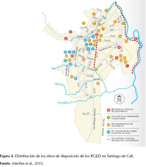 Otra de las causas del inadecuado manejo de los RC&D que se analiza a diario en la ciudad es que el municipio no cuenta con un sitio de disposición final para estos residuos, esto sumado a que muchos de los carretilleros y empresas llevan los desechos de manera ilegal a sitios no autorizados, como parques, zonas verdes y vías, hace que la generación de focos de contaminación alrededor de la ciudad traiga como consecuencia problemas de salubridad que afectan de manera directa a la población en general (DAGMA, 2014) (El País, 2008) (Diario El Pueblo, 2013). El DAGMA ha reportado que en la ciudad hay aproximadamente 109 botaderos de basura crónicos; entre ellos, 55 son sitios en donde se arrojan RC&D, de los cuales 36 siguen activos y 19 han sido intervenidos parcialmente por las autoridades de aseo, salud pública y medio ambiente de la ciudad, tal como se puede observar en la figura 4 (Sánchez et al., 2013) (Alcaldía de Santiago de Cali, 2012).