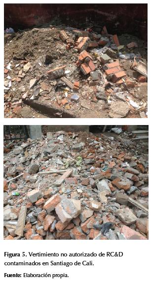 A pesar de todos los esfuerzos, el manejo que se da hoy a los RC&D en la ciudad de Cali continúa siendo inapropiado, por lo que estos terminan siendo tratados como un desecho y contaminados desde la fuente con otros materiales, e incluso con materia orgánica (figura 5). Esta mala práctica hace imposible llevar a cabo la labor de reciclaje y aprovechamiento de los RC&D (actividades que en la ciudad son poco habituales) (Yaprak et al., 2011). Por esta razón, antes de pensar en el aprovechamiento de estos materiales es indispensable que el plan de gestión y manejo de los RC&D de la ciudad se cumpla a cabalidad desde la fuente que los origina hasta el lugar de disposición ya sea final o de transferencia. Esto con el fin de que estas se conviertan en un centro de acopio en donde se realicen labores de selección y separación de los materiales aprovechables, para posteriormente distribuirlos a los diferentes procesos de reutilización correspondiente a cada tipo de residuo.