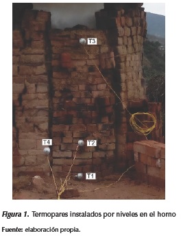 Para registrar la temperatura interna presentada en cada nivel del horno se instalaron termopares de bulbo de aleación de cromo aluminio tipo K con aislamiento cerámico y para las temperaturas externas termopares de alambre tipo K con recubrimiento fiberglass a 900 °F.