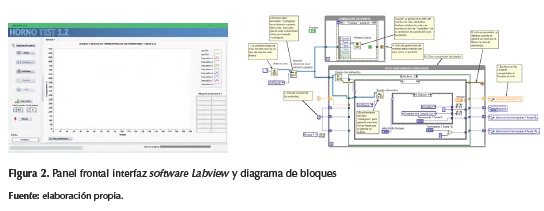 El panel de la interfaz para el usuario del sistema de adquisición permite monitorear y registrar las temperaturas en los niveles del horno estratificados durante todo el ciclo de cocción. Los registros generan tablas gráficas y numéricas, e indicadores para cada termopar. Con la librería de Labview se desarrolló el diagrama de bloques, que opera los indicadores que se colocaron en la interfaz del usuario.