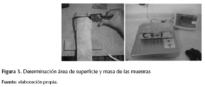 El ensayo se realizó de acuerdo con la norma técnica colombiana NTC 4017 a 5 muestras seleccionadas en cada nivel del horno y consistió en determinar el área de la superficie, la masa seca y la masa final; para medir las muestras se utilizó un pie de rey digital marca STANDARDGAGE con rango 350 mm ± 0,1 µm, para pesarlos una balanza electrónica digital marca PINZUAR modelo PG89.