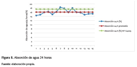 Se consideró el porcentaje máximo promedio de absorción de agua a las 24 horas para ladrillo de mampostería no estructural interior establecido en la norma NTC 4205 en 17,5 %, se encontraron tres valores por encima del recomendado con un valor máximo de 18,36 % y el mínimo de 14,47 %.