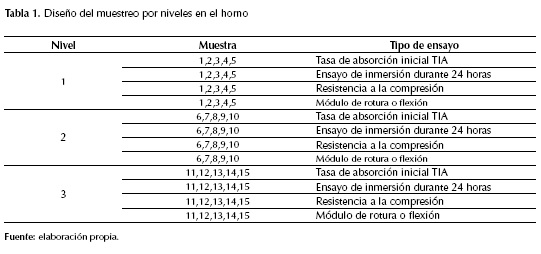 Se organizaron los bloques en el horno por niveles; para tomar las muestras se utilizó el muestreo por estratos indicado la Tabla 1, se dividió el área del horno en 3 niveles de manera que cada uno sea claramente diferenciable con el objetivo de tomar las muestras y que estas representen el conjunto o nivel del cual provienen (Alfaro, 2002); de cada nivel se seleccionaron 20 muestras y se utilizaron cinco para cada ensayo (Instituto Colombiano de Normas Técnicas NTC 4017, 2005).